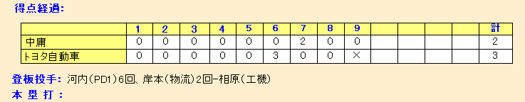 | 9/4 | 知事旗争奪 | トヨタ自動車 | 熱田球場 | 12:30 | 勝ち |
