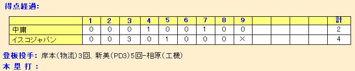 | 9/26 | 中部都市対抗 | 豊生ブレーキ | 蒲郡球場 | 9:00 | 勝ち |