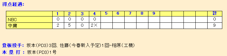 | 1/19 | 中日スポーツ杯 | SUNX | 瑞穂球場 | 9:00 | 勝ち |